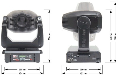 | Features 450° Pan und 270° Tilt 32 Voll- und Halbfarben + offen Tageslicht- und Kunstlichtkonversionsfilter 4 Gobos; rotier-, positionier- und wechselbar 5 Gobos; fest, wechselbar Morphing über 2 Gobo-Räder Highspeed Iris Shutter (11 Blitze pro Sekunde) Dimmer 0 - 100% Fokus Prisma; rotier-, positionier- und wechselbar Frost Automatische Positionsrückstellung Pan&Tilt Optik Doppelkondensor-Optik Leuchtmittel: HMI 575GS, zweiseitig gesockelt (keine Leuchtmitteljustierung mehr nötig) Glasreflektor Hochauflösendes Optiksystem |
