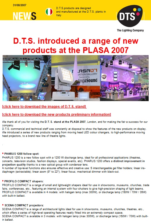 können Sie die letzte Pressemitteilung mit aktuellen News unseres Lieferanten DTS einsehen. Das Bühnenlicht und PAR Scheinwerfer werden in Deutschland über Lightronic GmbH vertrieben. |